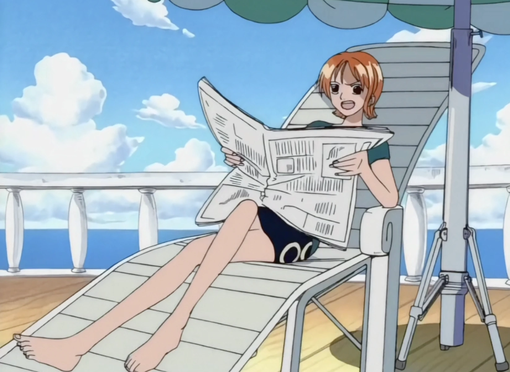 During the first part of the Skypiea Arc, she wore a light yellow short-sleeved shirt. She then changed into a bikini that was designed in a cloud pattern colored in blue, light blue and white. She paired her top with maroon trousers, and her orange high-heeled sandals. She also wore glasses for a small period of time.